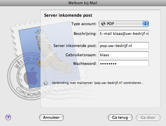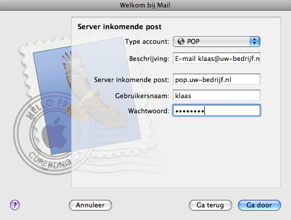 Geef hier de inkomende server op, bijvoorbeeld: pop.uw-bedrijf.nl |