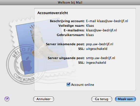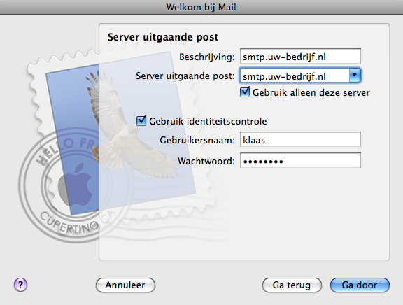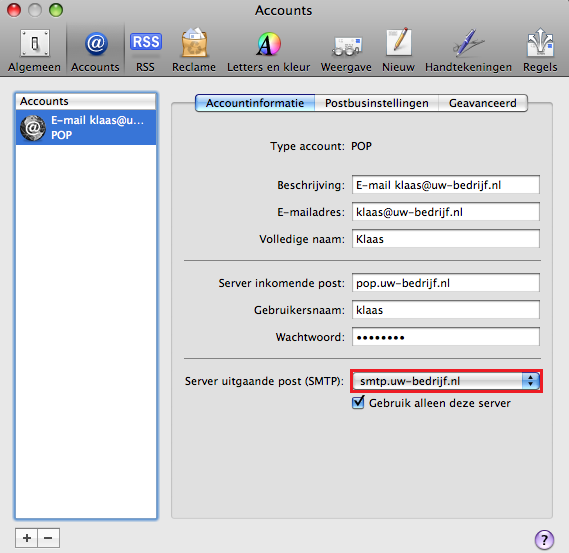 Geef hier een beschrijving van de uitgaande post bijvoorbeeld: smtp.uw-bedrijf.nl. |